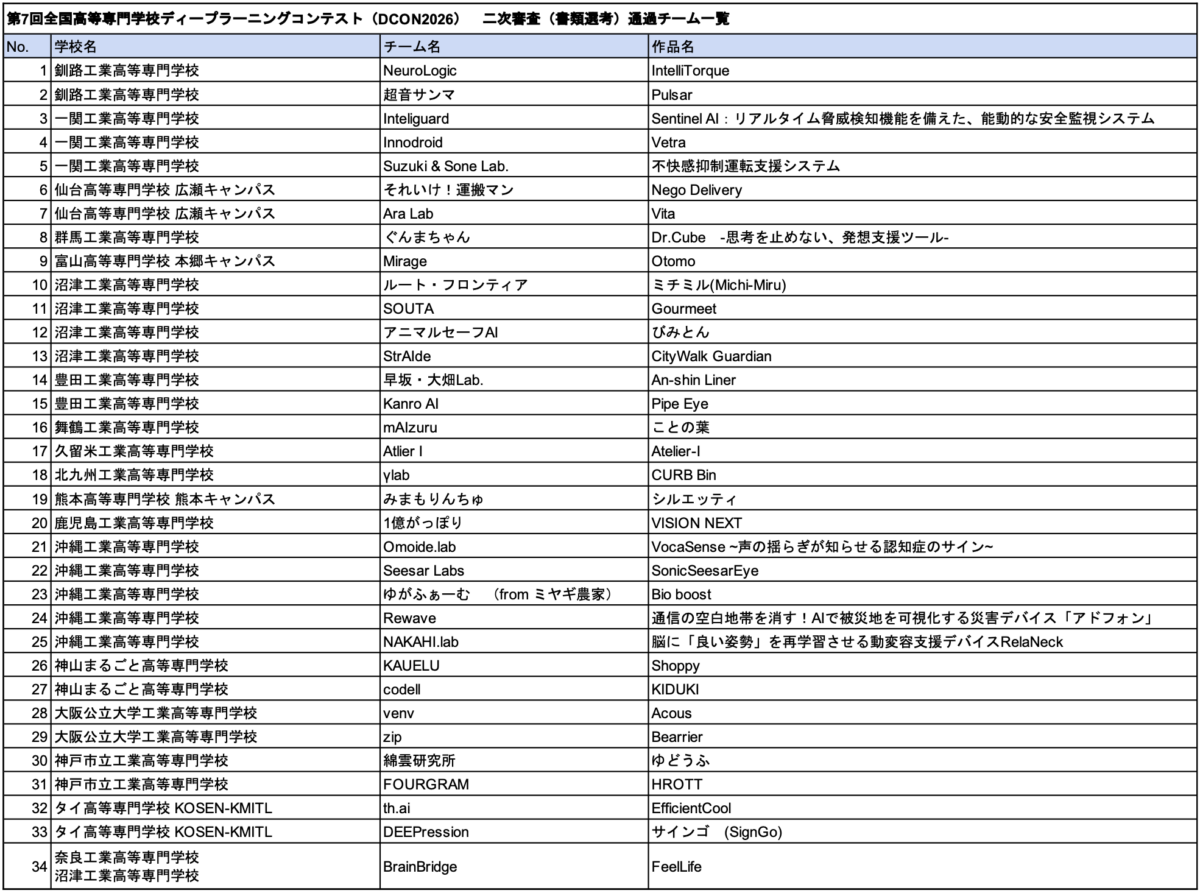 一般社団法人日本ディープラーニング協会(以下、「JDLA」)は、一般社団法人全国高等専門学校連合会、日本放送協会(NHK)、株式会社NHKエンタープライズの4団体で構成するDCON実行委員会が実施する高専生による「ものづくり」とディープラーニングを活用した事業創出コンテスト「第7回 全国高等専門学校ディープラーニングコンテスト2026(以下、「DCON2026」)」において、二次審査(書類選考)の結果、面談選考へ進む34チームを決定しました。