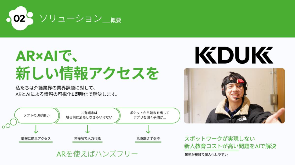 介護現場では人手不足が深刻化し、知識の属人化により未経験者が働きにくい課題があります。本取り組みは、AR×AIを活用し「今・誰に・何をすべきか」を即座に可視化。経験差をテクノロジーで補い、人手不足下でも質を維持できる介護現場の実現を目指します。