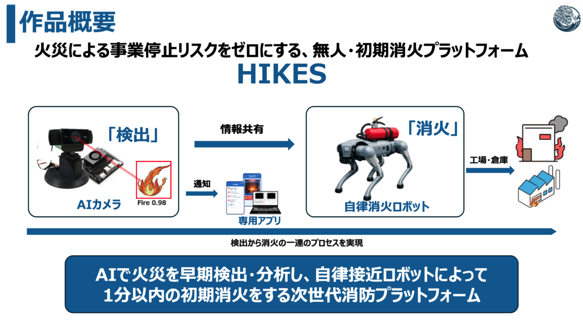 無人防災市場の拡大と世界的な出火件数の増加を背景に、火災の早期検出から初期消火までを自動化する次世代消火プラットフォーム「HIKES」を提案。AIカメラによる高精度な火災検出・解析と、消火ユニットを搭載した四足歩行ロボットの高い機動力を組み合わせ、従来困難であった「発生から1分以内の初期消火」を実現する。無人完遂型システムにより、火災被害を左右する”空白の5分”を埋め、防災の新たなスタンダードを目指す。