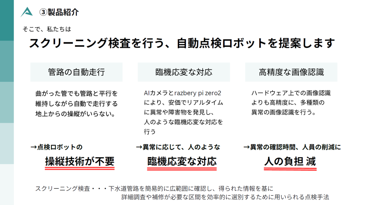 日本では下水道の老朽化による陥没が社会課題となる中、現場の人手不足も深刻化しており、5年に1度の点検も困難になると予測されています。従来の方法では危険かつ時間がかかり、点検手法の改善は社会的急務となっています。そこで、スクリーニング検査を、リアルタイムに画像認識をしながら臨機応変に対応できる、スマートな自動点検ロボットを開発しました。